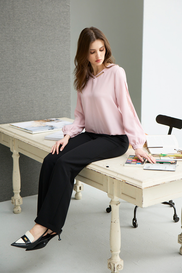 [Z0751]甜美OL手臂挖空蕾絲上衣 藍 M