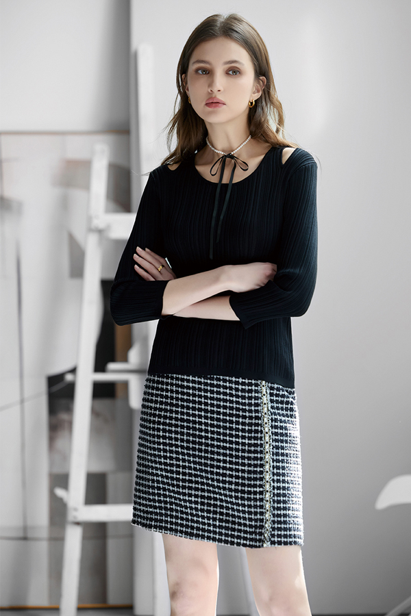 [Z2214]貴氣小香風窄短裙 黑格 M