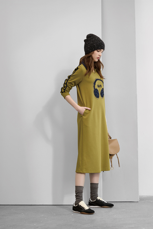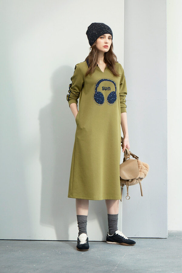 [Z3004]率性休閒耳機立領洋裝 綠 M