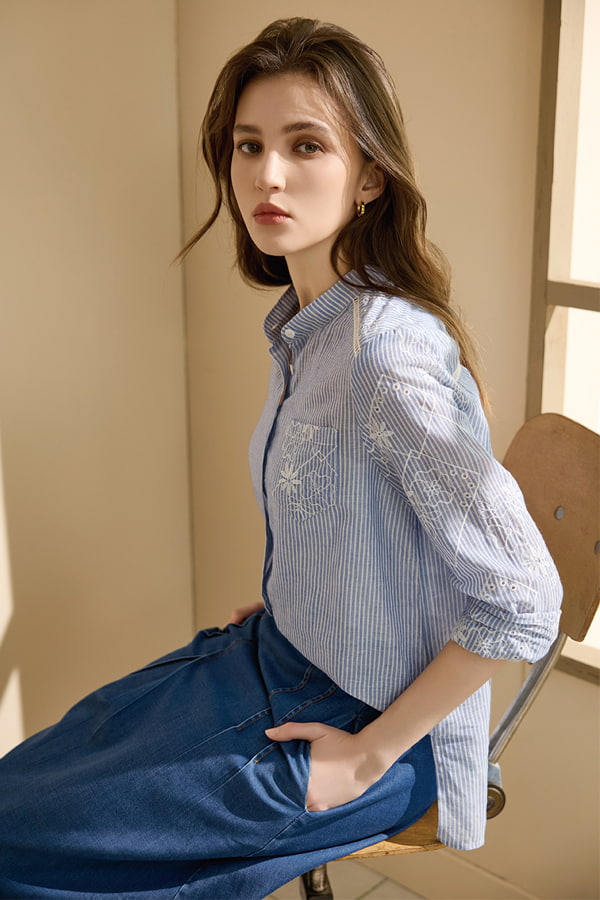 [Z7057]優美花朵刺繡長板襯衫 白條紋 M