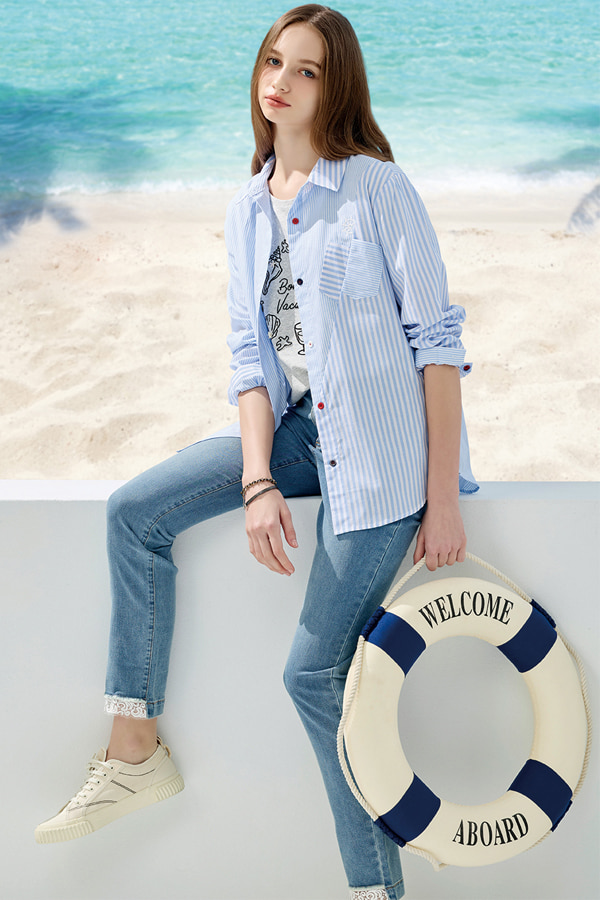 [Y0212]下擺蕾絲拼接設計牛仔長褲