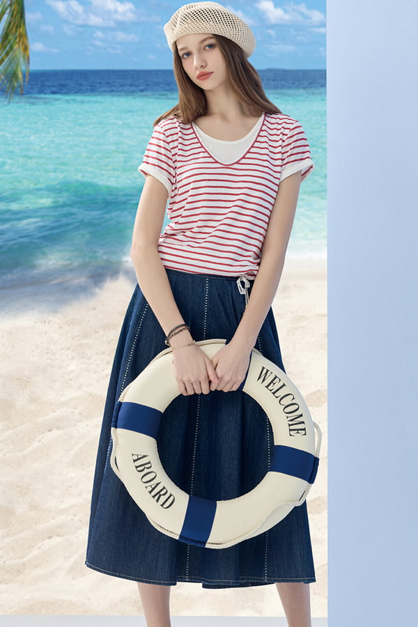 [Y0710]條紋下襬結綁假兩件式上衣