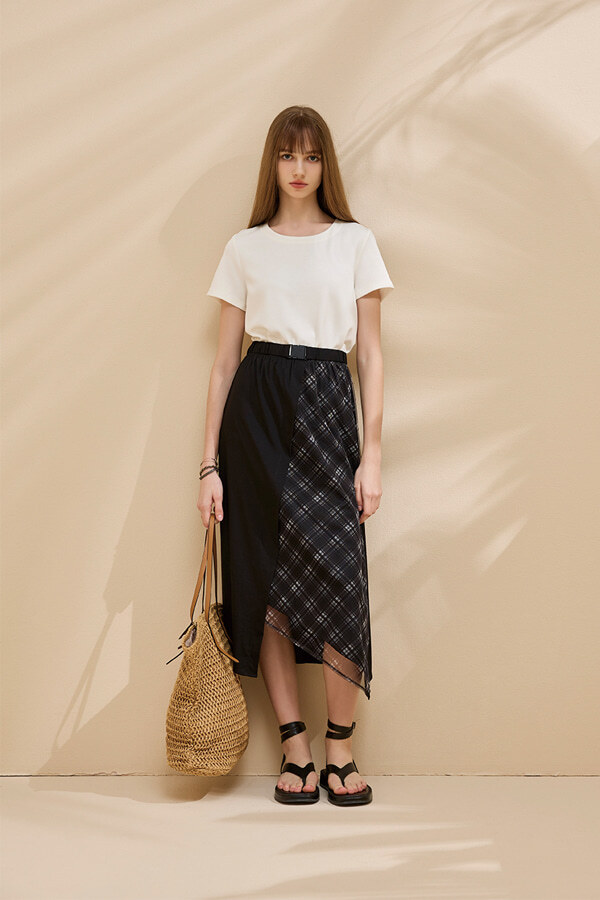 [Y3002]OL風素面格紋腰帶假二件式洋裝 白 M